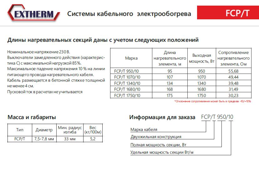 Номинальное напряжение 230В. Выключатели замедленного действия (характеристика C) с максимальной нагрузкой 85%. Максимальное падение напряжения 10% на линии питающего провода нагревательного кабеля. Кабель размещается в бетонной стяжке толщиной не менее 4 см. Пусковой ток в расчетах не учитывается.