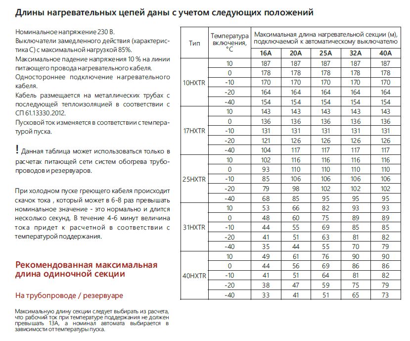 Максимальную длину секции следует выбирать из расчета, что рабочий ток при температуре поддержания не должен превышать 13А, а номинал автомата выбирается в зависимости от температуры пуска.