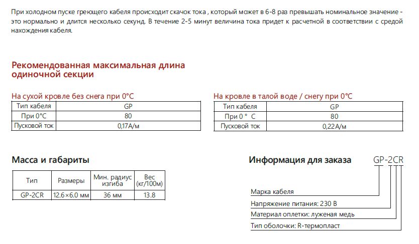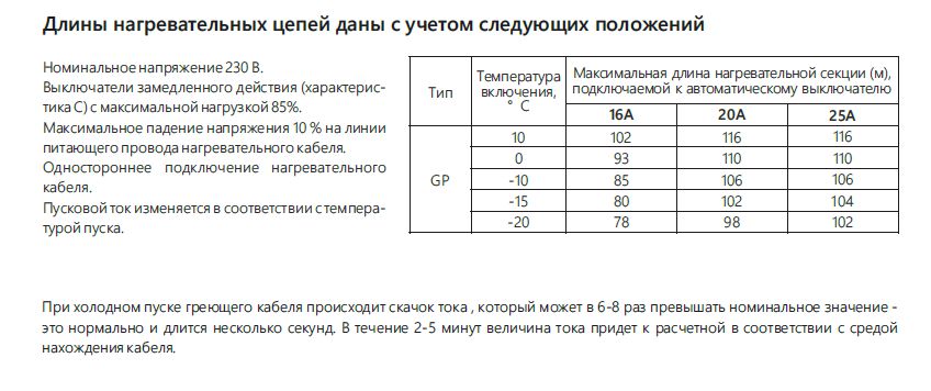 Номинальное напряжение 230 В. Выключатели замедленного действия (характеристика C) с максимальной нагрузкой 85%. Максимальное падение напряжения 10 % на линии питающего провода нагревательного кабеля. Одностороннее подключение нагревательного кабеля.