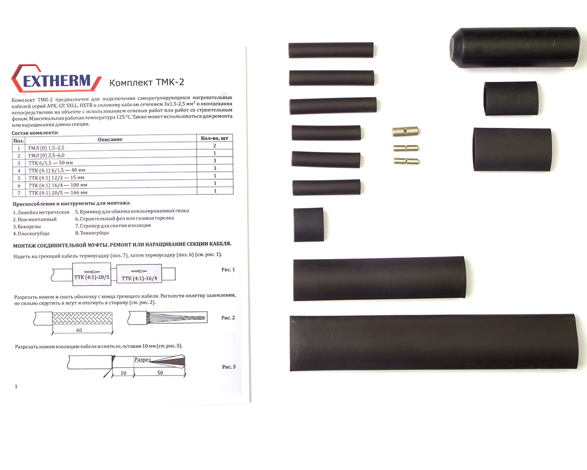 Комплект ТМК-2 предназначен для подключения саморегулирующихся нагревательных кабелей серий АКP, GP, SXLL, HXTR к силовому кабелю сечением 3х1,5-2,5 мм² и оконцевания непосредственно на объекте с использованием огневых работ или работ со строительным феном. Максимальная рабочая температура 125 °С. Также может использоваться для ремонта или наращивания длины секции.