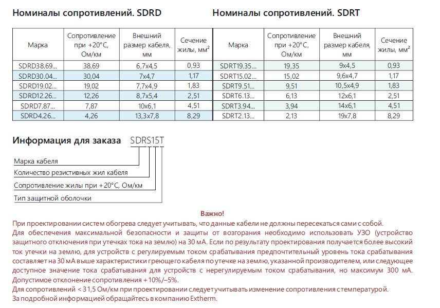 При проектировании систем обогрева следует учитывать, что данные кабели не должны пересекаться сами с собой.Для обеспечения максимальной безопасности и защиты от возгорания необходимо использовать УЗО (устройство защитного отключения при утечках тока на землю) на 30 мА. Если по результату проектирования получается более высокий ток утечки на землю, для устройств с регулируемым током срабатывания предпочтительный уровень тока срабатывания составляет на 30 мА выше характеристики греющего кабеля по утечке на землю, указанной производителем, или следующее доступное значение тока срабатывания для устройств с нерегулируемым током срабатывания, но максимум 300 мА. Допустимое отклонение сопротивления +10%/–5%. Для сопротивлений < 31,5 Ом/км при проектировании следует учитывать изменение сопротивления с температурой. За подробной информацией обращайтесь в компанию Extherm.