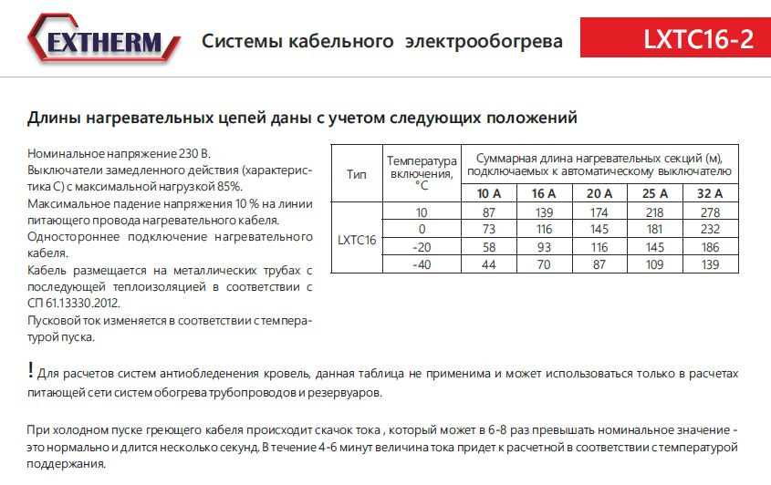 !Для расчетов систем антиобледенения кровель, данная таблица не применима и может использоваться только в расчетах питающей сети систем обогрева трубопроводов и резервуаров. При холодном пуске греющего кабеля происходит скачок тока , который может в 6-8 раз превышать номинальное значение - это нормально и длится несколько секунд. В течение 4-6 минут величина тока придет к расчетной в соответствии с температурой поддержания.