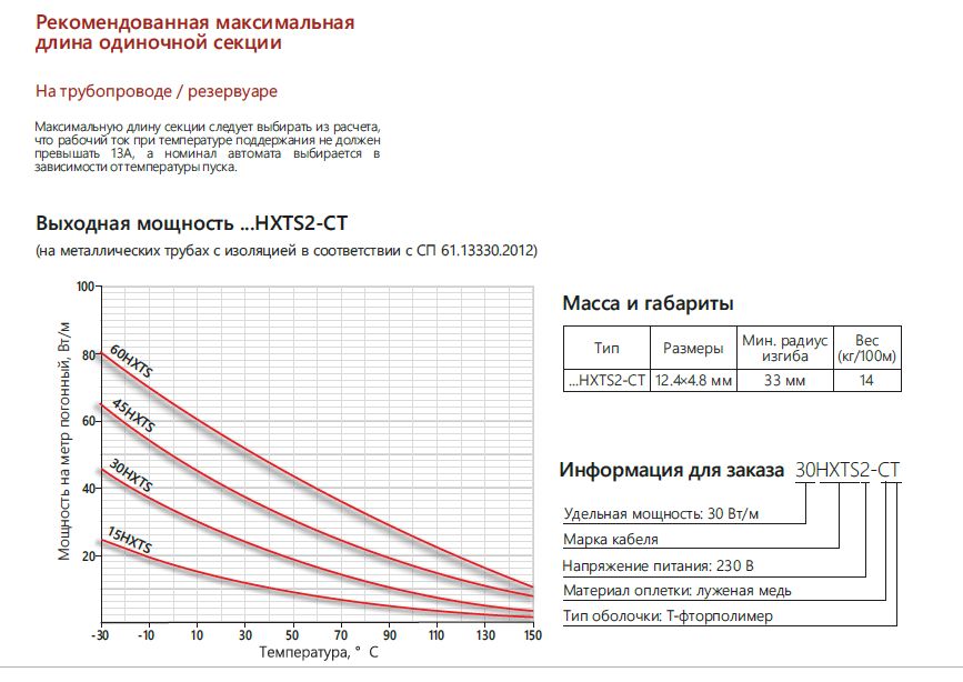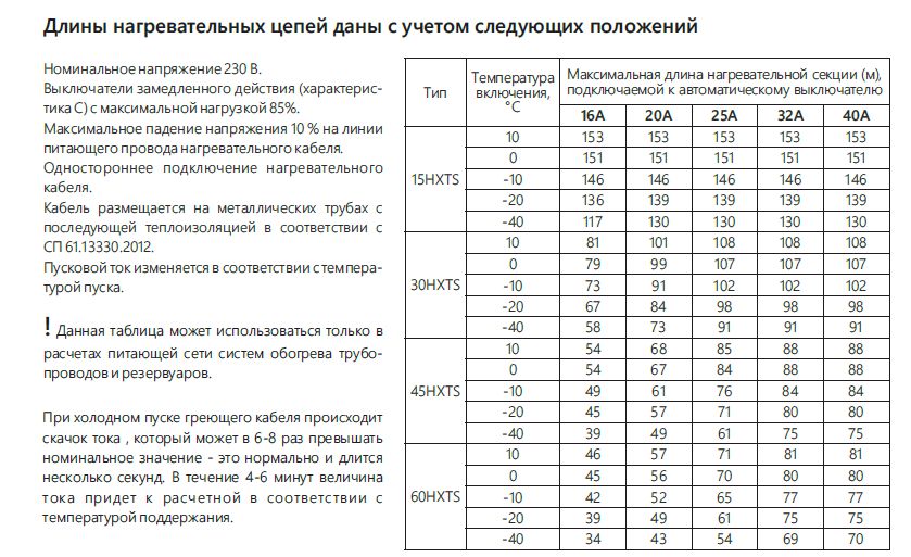 Максимальную длину секции следует выбирать из расчета, что рабочий ток при температуре поддержания не должен превышать 13А, а номинал автомата выбирается в зависимости от температуры пуска.
