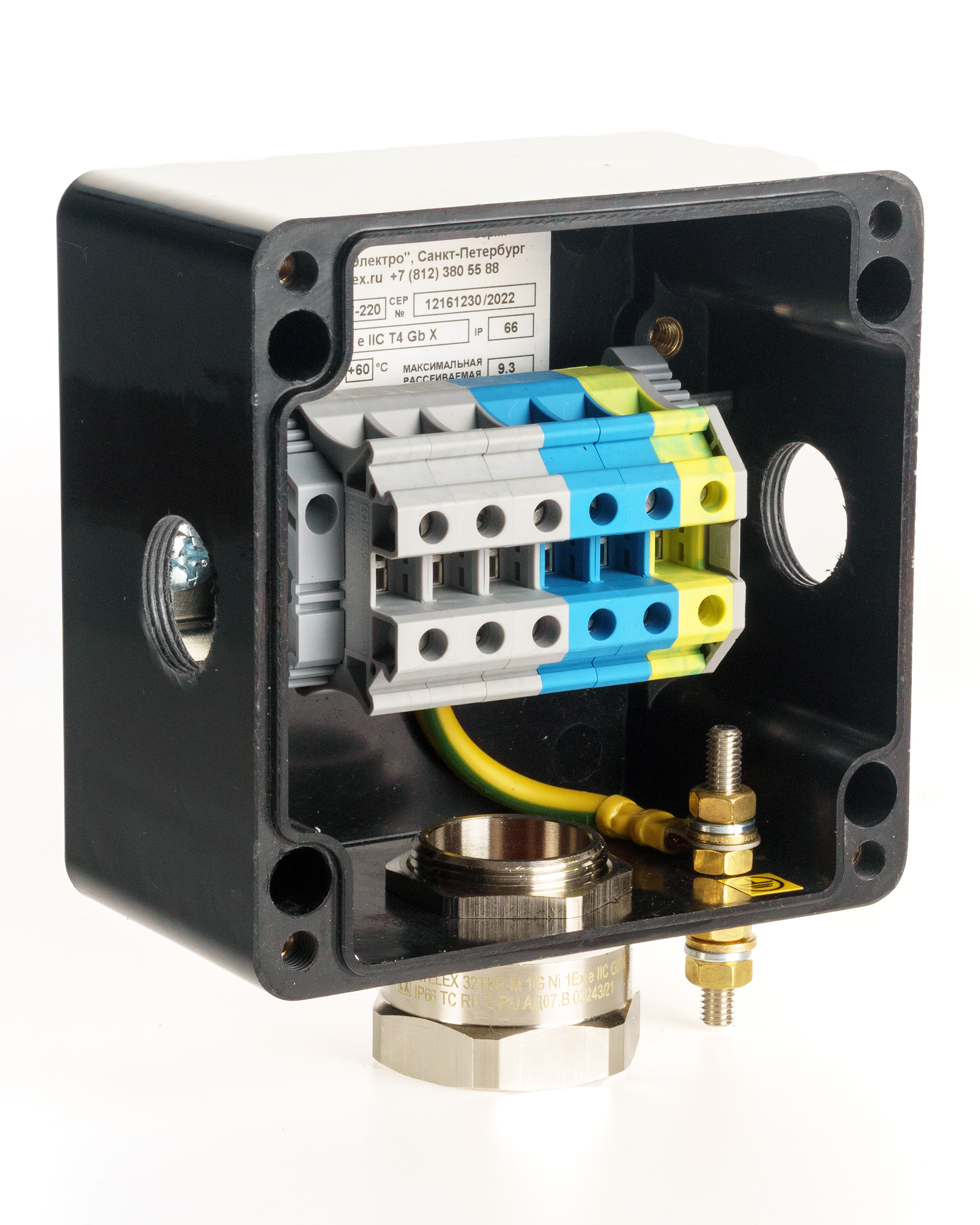 Коробка клеммная взрывозащищенная проходная на основе модульного управляющего устройства серии MT с металлической опорой. Для подключения от 1 до 3-х плоских греющих кабелей или от 1 до 3-х сигнальных кабелей Ø1-3 мм , 2 резьбовых отверстия М25x1,5 с заглушками, клеммная колодка на 7 модулей 10 мм2 (3L+2N с перемычкой+2PE).