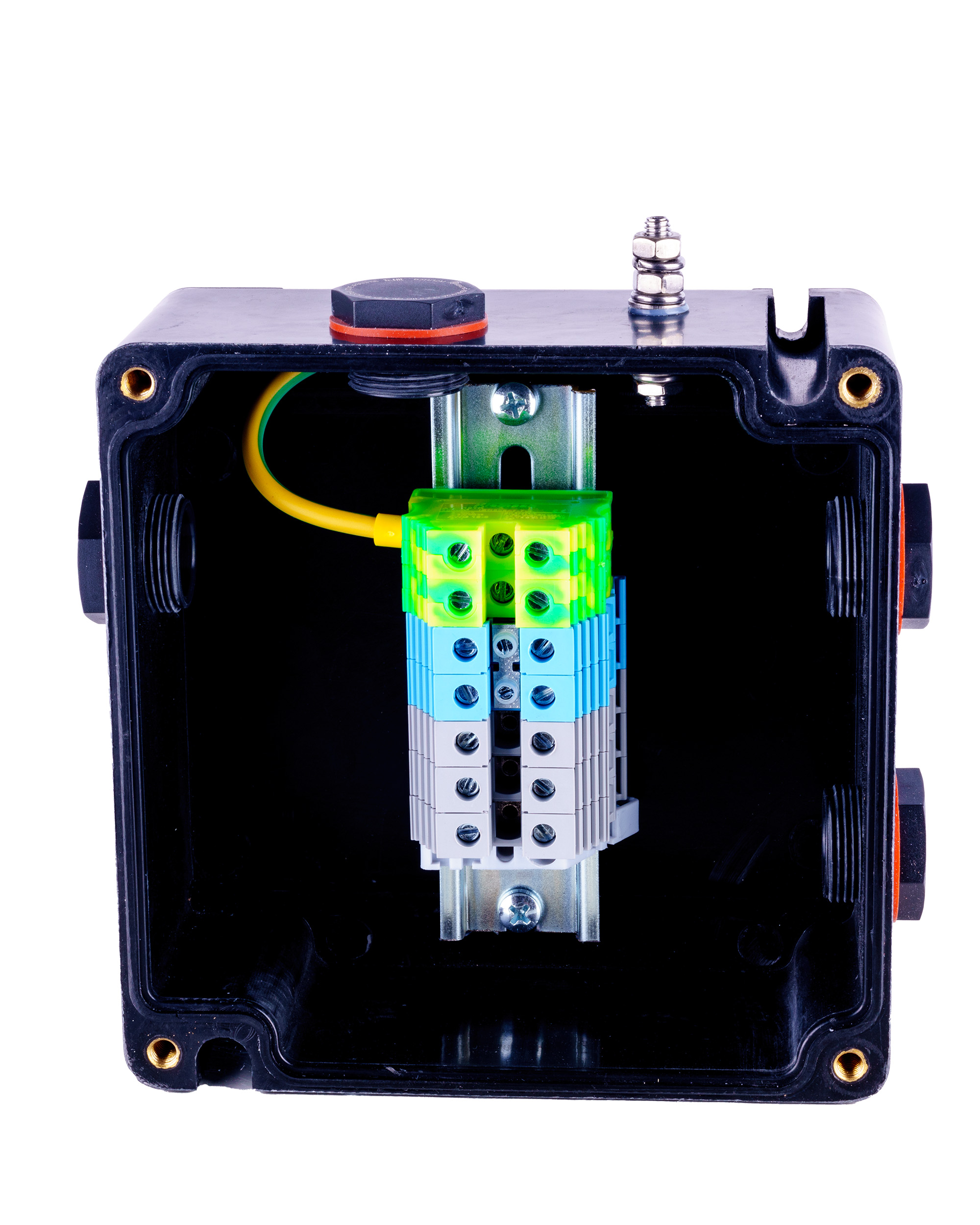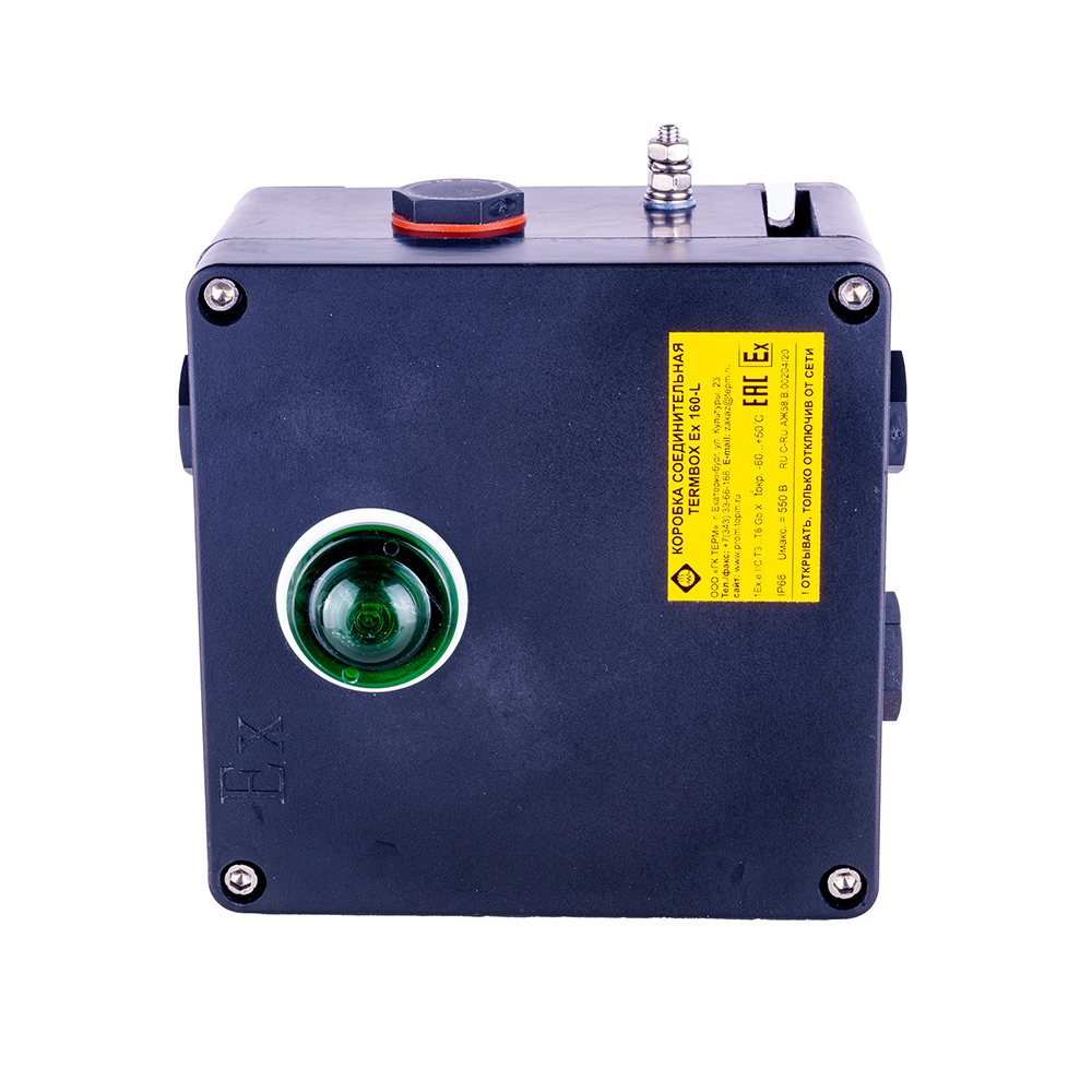 Коробка соединительная Extherm TermBox Ex 160-L предназначена для соединения и разветвления кабелей нагревательных саморегулирующихся, подключения силовых кабелей к кабелям нагревательным саморегулирующимся с индикацией напряжения на кабелях нагревательных саморегулирующихся и резистивных нагревательных кабелях. Коробка устанавливается на трубопровод при помощи кронштейна или на близлежащую металлоконструкцию. Применяемые клеммные наборы позволяют выполнить подключение многожильных или одножильных кабелей сечением от 0,5 до 10 мм².
